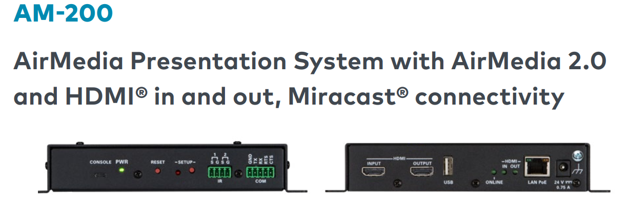 Le raccordement de votre équipement à la sonorisation et aux « displays » vidéo s’effectue par l’intermédiaire des boitiers AirMedia® AM-200 ou AM-300. Ces boitiers, eux-mêmes configurés sur le même réseau que l’ensemble de vos équipements audiovisuels, récupèreront votre contenu à partager. Pour vous connecter, il suffit de suivre les instructions très simples qui sont indiquées à l’écran: une adresse IP, un code aléatoire (ou fixe que vous aurez déterminé auparavant) et vous n’aurez plus qu’à vous soucier de votre contenu à partager et de votre communication.