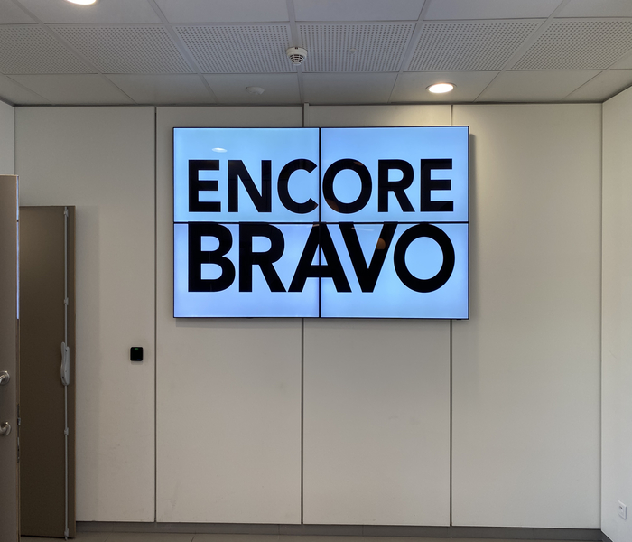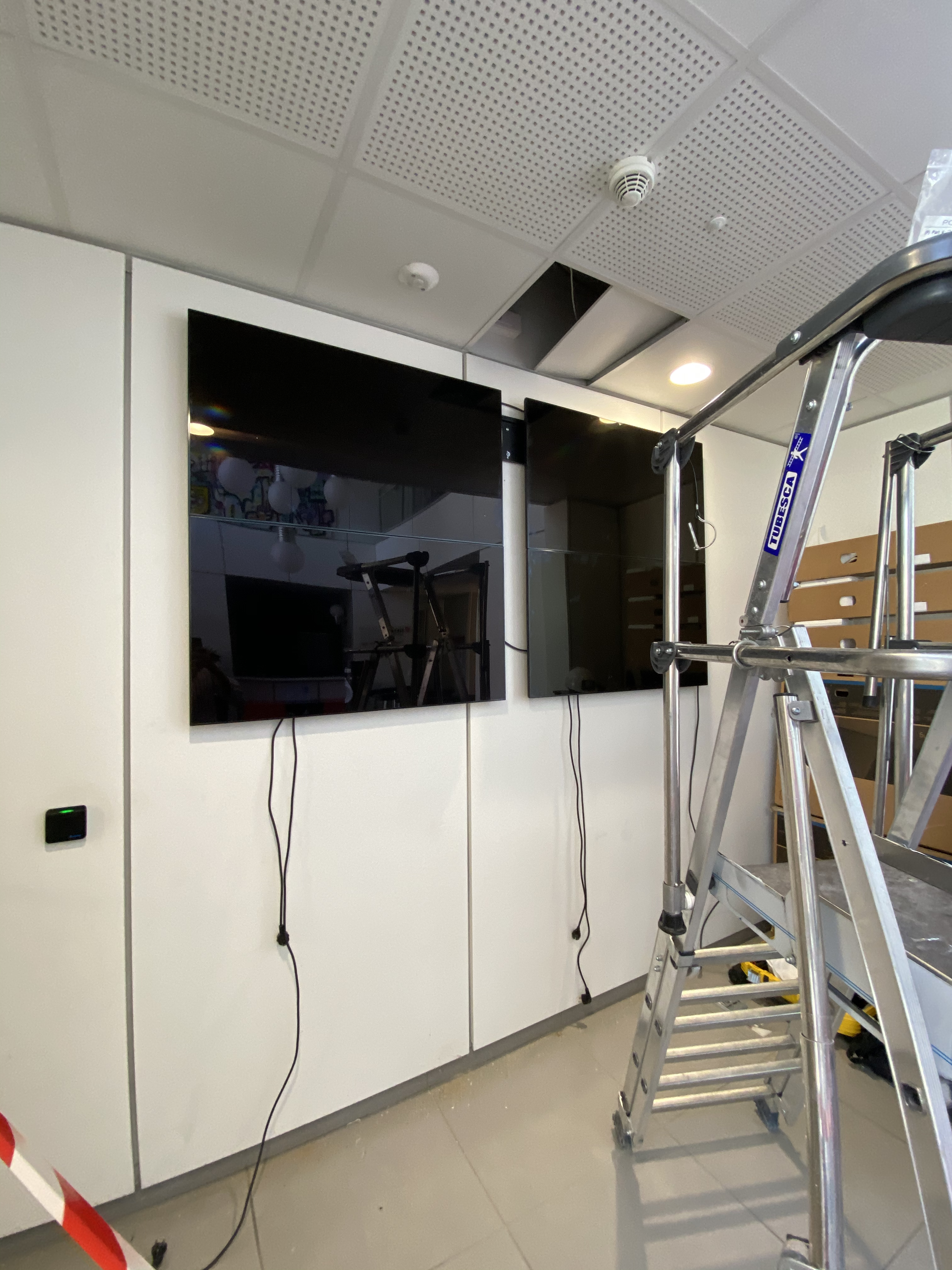 Ce client avait auparavant un seul écran et au vu de l’espace disponible, nous lui avons préconisé l’installation de 4 grands écrans associés à une interface logicielle pour diffuser des contenus programmables et modifiables en temps réel.